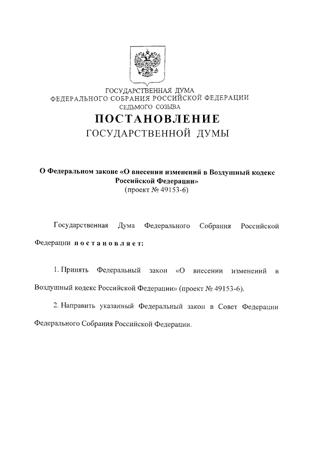 "О ФЕДЕРАЛЬНОМ ЗАКОНЕ "О ВНЕСЕНИИ ИЗМЕНЕНИЙ В ВОЗДУШНЫЙ КОДЕКС РОССИЙСКОЙ ФЕДЕРАЦИИ" (ПРОЕКТ N 49153-6)"