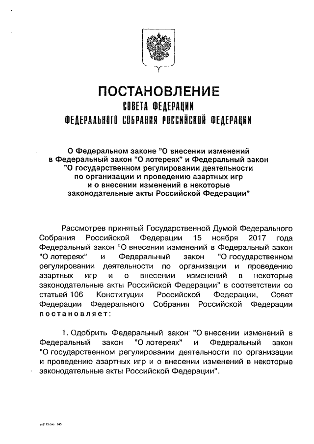 "О ФЕДЕРАЛЬНОМ ЗАКОНЕ "О ВНЕСЕНИИ ИЗМЕНЕНИЙ В ФЕДЕРАЛЬНЫЙ ЗАКОН "О ЛОТЕРЕЯХ" И ФЕДЕРАЛЬНЫЙ ЗАКОН "О ГОСУДАРСТВЕННОМ РЕГУЛИРОВАНИИ ДЕЯТЕЛЬНОСТИ ПО ОРГАНИЗАЦИИ И ПРОВЕДЕНИЮ АЗАРТНЫХ ИГР И О ВНЕСЕНИИ ИЗМЕНЕНИЙ В НЕКОТОРЫЕ ЗАКОНОДАТЕЛЬНЫЕ АКТЫ РОССИЙСКОЙ ФЕДЕРАЦИИ"
