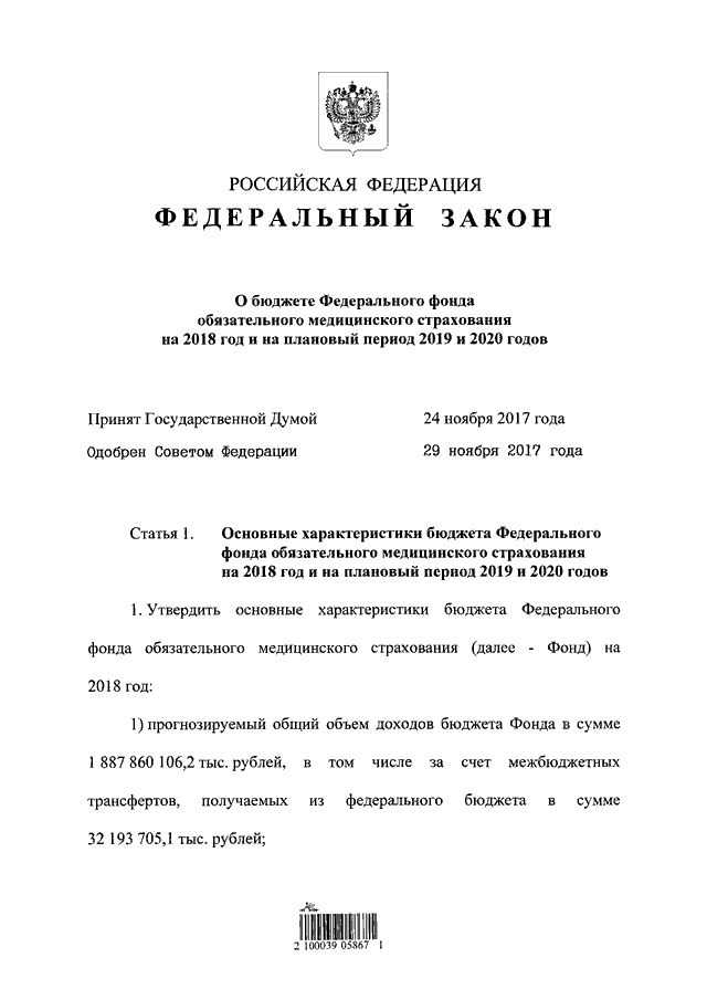 "О БЮДЖЕТЕ ФЕДЕРАЛЬНОГО ФОНДА ОБЯЗАТЕЛЬНОГО МЕДИЦИНСКОГО СТРАХОВАНИЯ НА 2018 ГОД И НА ПЛАНОВЫЙ ПЕРИОД 2019 И 2020 ГОДОВ"