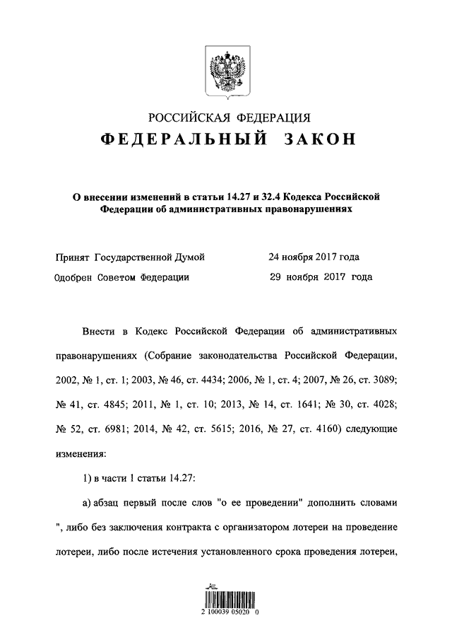 "О ВНЕСЕНИИ ИЗМЕНЕНИЙ В СТАТЬИ 14.27 И 32.4 КОДЕКСА РОССИЙСКОЙ ФЕДЕРАЦИИ ОБ АДМИНИСТРАТИВНЫХ ПРАВОНАРУШЕНИЯХ"