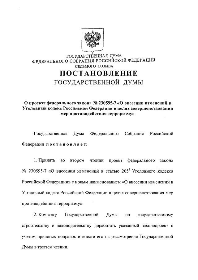 "О ПРОЕКТЕ ФЕДЕРАЛЬНОГО ЗАКОНА N 230595-7 "О ВНЕСЕНИИ ИЗМЕНЕНИЙ В УГОЛОВНЫЙ КОДЕКС РОССИЙСКОЙ ФЕДЕРАЦИИ В ЦЕЛЯХ СОВЕРШЕНСТВОВАНИЯ МЕР ПРОТИВОДЕЙСТВИЯ ТЕРРОРИЗМУ"