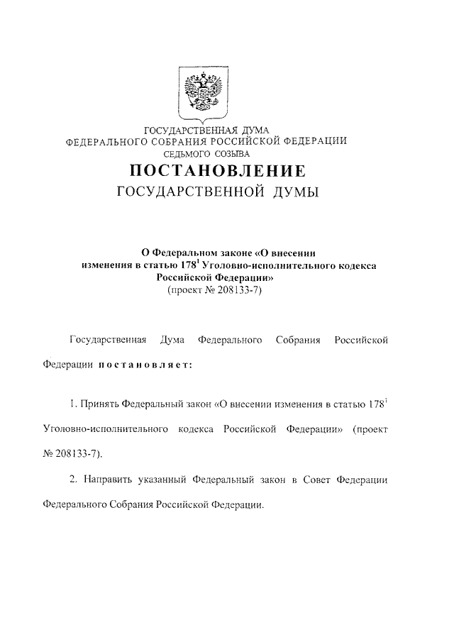 "О ФЕДЕРАЛЬНОМ ЗАКОНЕ "О ВНЕСЕНИИ ИЗМЕНЕНИЯ В СТАТЬЮ 178.1 УГОЛОВНО - ИСПОЛНИТЕЛЬНОГО КОДЕКСА РОССИЙСКОЙ ФЕДЕРАЦИИ" (ПРОЕКТ N 208133-7)"