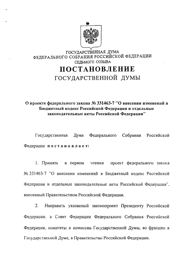 "О ПРОЕКТЕ ФЕДЕРАЛЬНОГО ЗАКОНА N 331463-7 "О ВНЕСЕНИИ ИЗМЕНЕНИЙ В БЮДЖЕТНЫЙ КОДЕКС РОССИЙСКОЙ ФЕДЕРАЦИИ И ОТДЕЛЬНЫЕ ЗАКОНОДАТЕЛЬНЫЕ АКТЫ РОССИЙСКОЙ ФЕДЕРАЦИИ"
