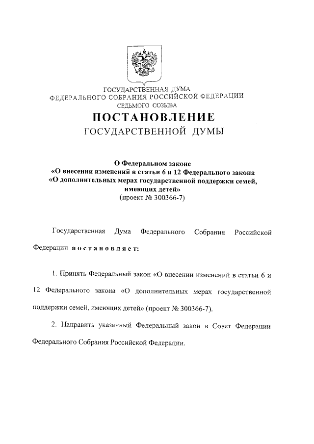 "О ФЕДЕРАЛЬНОМ ЗАКОНЕ "О ВНЕСЕНИИ ИЗМЕНЕНИЙ В СТАТЬИ 6 И 12 ФЕДЕРАЛЬНОГО ЗАКОНА "О ДОПОЛНИТЕЛЬНЫХ МЕРАХ ГОСУДАРСТВЕННОЙ ПОДДЕРЖКИ СЕМЕЙ, ИМЕЮЩИХ ДЕТЕЙ" (ПРОЕКТ N 300366-7)"