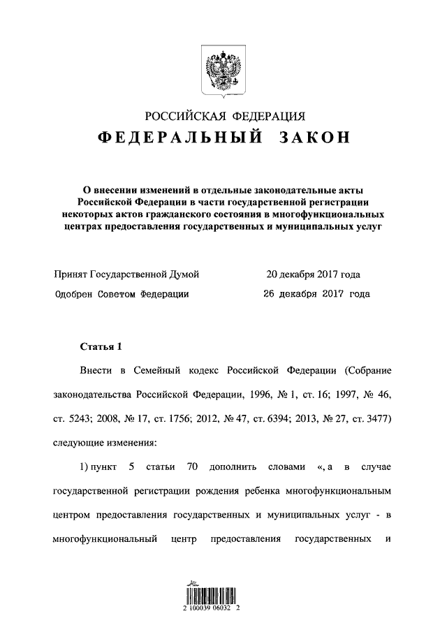 "О ВНЕСЕНИИ ИЗМЕНЕНИЙ В ОТДЕЛЬНЫЕ ЗАКОНОДАТЕЛЬНЫЕ АКТЫ РОССИЙСКОЙ ФЕДЕРАЦИИ В ЧАСТИ ГОСУДАРСТВЕННОЙ РЕГИСТРАЦИИ НЕКОТОРЫХ АКТОВ ГРАЖДАНСКОГО СОСТОЯНИЯ В МНОГОФУНКЦИОНАЛЬНЫХ ЦЕНТРАХ ПРЕДОСТАВЛЕНИЯ ГОСУДАРСТВЕННЫХ И МУНИЦИПАЛЬНЫХ УСЛУГ"