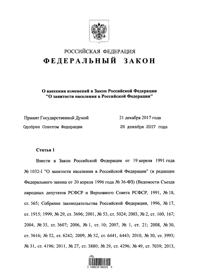 "О ВНЕСЕНИИ ИЗМЕНЕНИЙ В ЗАКОН РОССИЙСКОЙ ФЕДЕРАЦИИ "О ЗАНЯТОСТИ НАСЕЛЕНИЯ В РОССИЙСКОЙ ФЕДЕРАЦИИ"