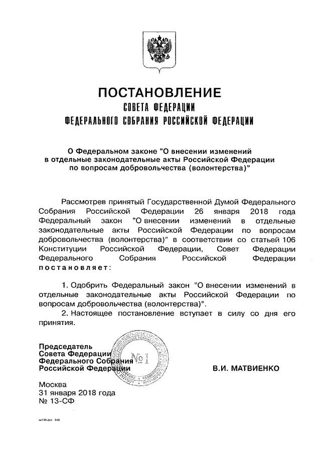 ПОСТАНОВЛЕНИЕ СФ ФС РФ от 31.01.2018 N 13-СФ