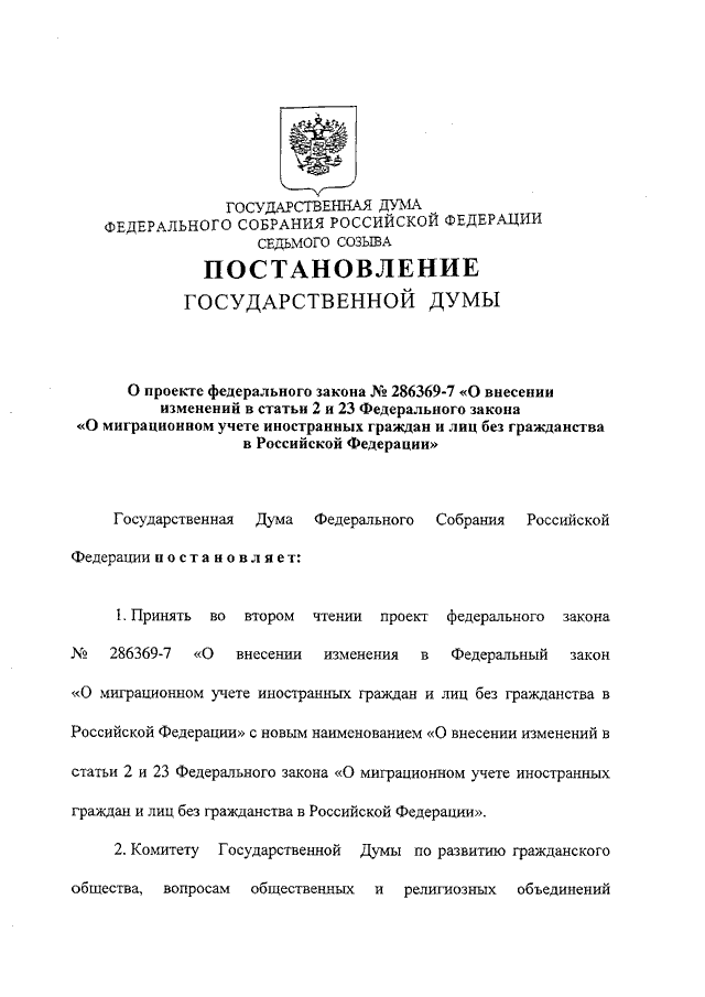 "О ПРОЕКТЕ ФЕДЕРАЛЬНОГО ЗАКОНА N 286369-7 "О ВНЕСЕНИИ ИЗМЕНЕНИЙ В СТАТЬИ 2 И 23 ФЕДЕРАЛЬНОГО ЗАКОНА "О МИГРАЦИОННОМ УЧЕТЕ ИНОСТРАННЫХ ГРАЖДАН И ЛИЦ БЕЗ ГРАЖДАНСТВА В РОССИЙСКОЙ ФЕДЕРАЦИИ"