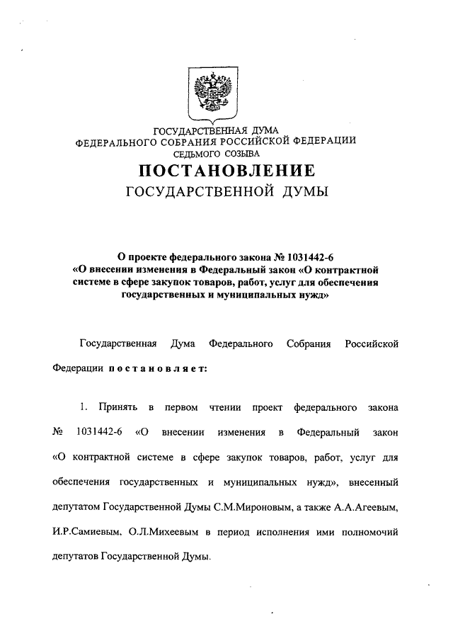 "О ПРОЕКТЕ ФЕДЕРАЛЬНОГО ЗАКОНА N 1031442-6 "О ВНЕСЕНИИ ИЗМЕНЕНИЯ В ФЕДЕРАЛЬНЫЙ ЗАКОН "О КОНТРАКТНОЙ СИСТЕМЕ В СФЕРЕ ЗАКУПОК ТОВАРОВ, РАБОТ, УСЛУГ ДЛЯ ОБЕСПЕЧЕНИЯ ГОСУДАРСТВЕННЫХ И МУНИЦИПАЛЬНЫХ НУЖД"