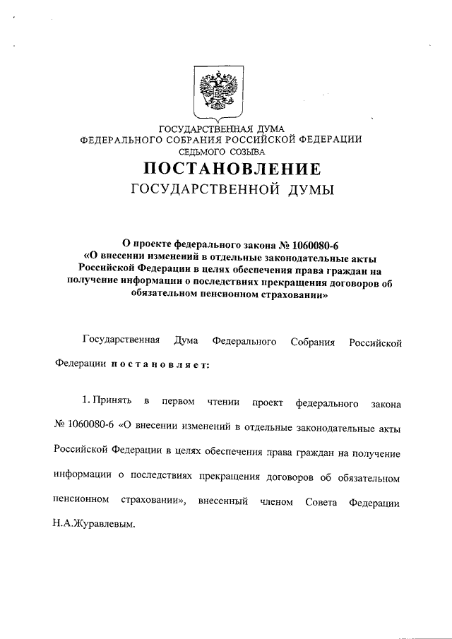 "О ПРОЕКТЕ ФЕДЕРАЛЬНОГО ЗАКОНА N 1060080-6 "О ВНЕСЕНИИ ИЗМЕНЕНИЙ В
