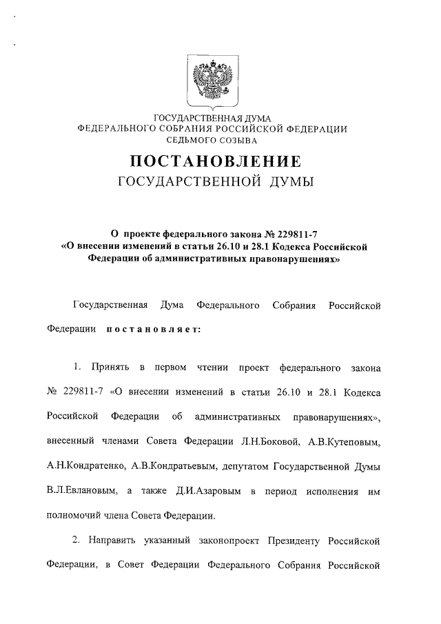 "О ПРОЕКТЕ ФЕДЕРАЛЬНОГО ЗАКОНА N 229811-7 "О ВНЕСЕНИИ ИЗМЕНЕНИЙ В СТАТЬИ 26.10 И 28.1 КОДЕКСА РОССИЙСКОЙ ФЕДЕРАЦИИ ОБ АДМИНИСТРАТИВНЫХ ПРАВОНАРУШЕНИЯХ"