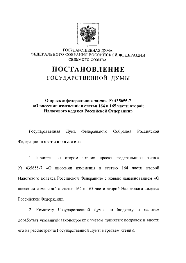 "О ПРОЕКТЕ ФЕДЕРАЛЬНОГО ЗАКОНА N 435655-7 "О ВНЕСЕНИИ ИЗМЕНЕНИЙ В СТАТЬИ 164 И 165 ЧАСТИ ВТОРОЙ НАЛОГОВОГО КОДЕКСА РОССИЙСКОЙ ФЕДЕРАЦИИ"