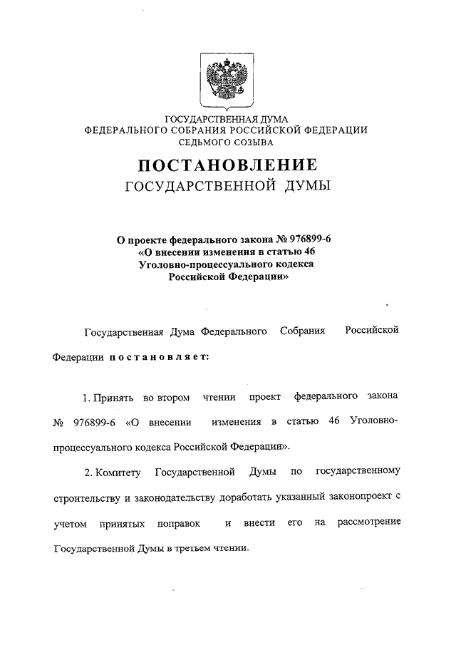 "О ПРОЕКТЕ ФЕДЕРАЛЬНОГО ЗАКОНА N 976899-6 "О ВНЕСЕНИИ ИЗМЕНЕНИЯ В СТАТЬЮ 46 УГОЛОВНО - ПРОЦЕССУАЛЬНОГО КОДЕКСА РОССИЙСКОЙ ФЕДЕРАЦИИ"
