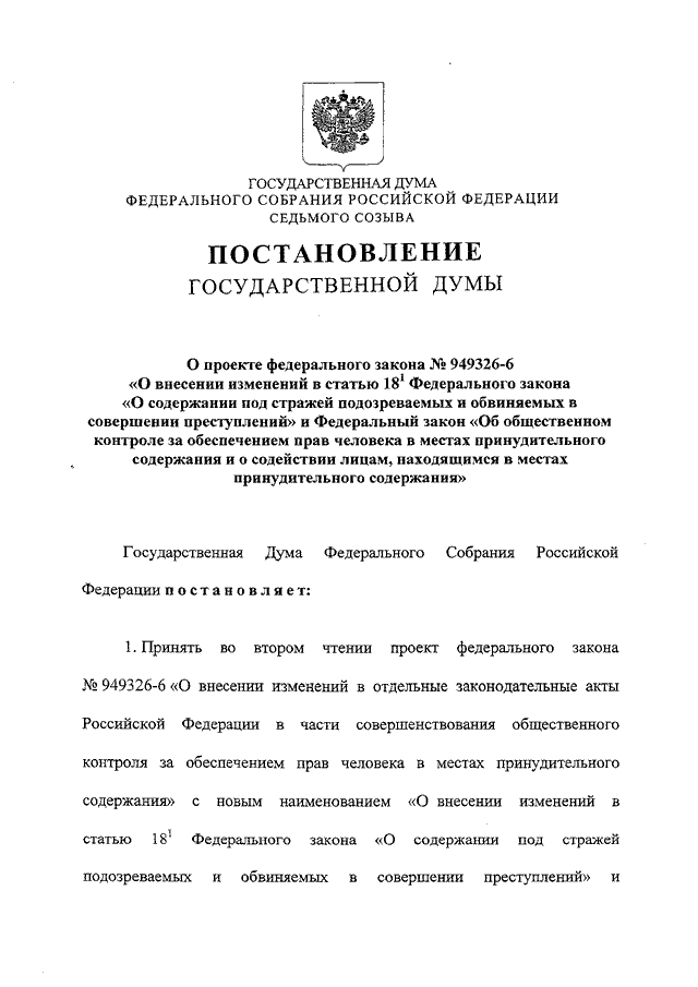 "О ПРОЕКТЕ ФЕДЕРАЛЬНОГО ЗАКОНА N 949326-6 "О ВНЕСЕНИИ ИЗМЕНЕНИЙ В СТАТЬЮ 18.1 ФЕДЕРАЛЬНОГО ЗАКОНА "О СОДЕРЖАНИИ ПОД СТРАЖЕЙ ПОДОЗРЕВАЕМЫХ И ОБВИНЯЕМЫХ В СОВЕРШЕНИИ ПРЕСТУПЛЕНИЙ" И ФЕДЕРАЛЬНЫЙ ЗАКОН "ОБ ОБЩЕСТВЕННОМ КОНТРОЛЕ ЗА ОБЕСПЕЧЕНИЕМ ПРАВ ЧЕЛОВЕКА В МЕСТАХ ПРИНУДИТЕЛЬНОГО СОДЕРЖАНИЯ И О СОДЕЙСТВИИ ЛИЦАМ, НАХОДЯЩИМСЯ В МЕСТАХ ПРИНУДИТЕЛЬНОГО СОДЕРЖАНИЯ"