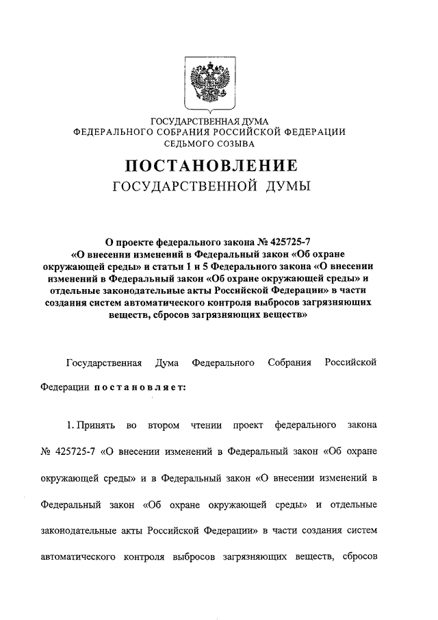 "О ПРОЕКТЕ ФЕДЕРАЛЬНОГО ЗАКОНА N 425725-7 "О ВНЕСЕНИИ ИЗМЕНЕНИЙ В ФЕДЕРАЛЬНЫЙ ЗАКОН "ОБ ОХРАНЕ ОКРУЖАЮЩЕЙ СРЕДЫ" И СТАТЬИ 1 И 5 ФЕДЕРАЛЬНОГО ЗАКОНА "О ВНЕСЕНИИ ИЗМЕНЕНИЙ В ФЕДЕРАЛЬНЫЙ ЗАКОН "ОБ ОХРАНЕ ОКРУЖАЮЩЕЙ СРЕДЫ" И ОТДЕЛЬНЫЕ ЗАКОНОДАТЕЛЬНЫЕ АКТЫ РОССИЙСКОЙ ФЕДЕРАЦИИ" В ЧАСТИ СОЗДАНИЯ СИСТЕМ АВТОМАТИЧЕСКОГО КОНТРОЛЯ ВЫБРОСОВ ЗАГРЯЗНЯЮЩИХ ВЕЩЕСТВ, СБРОСОВ ЗАГРЯЗНЯЮЩИХ ВЕЩЕСТВ"