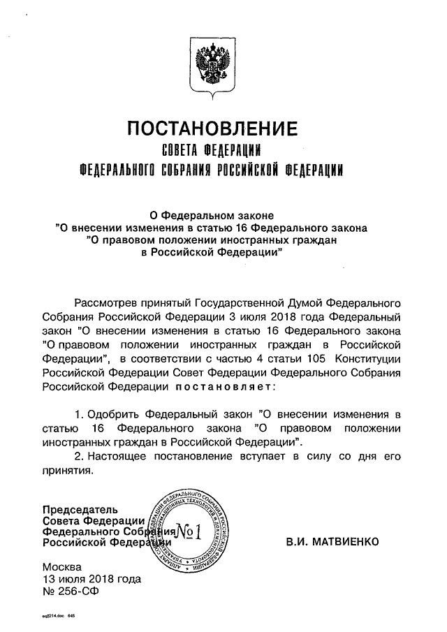 ПОСТАНОВЛЕНИЕ СФ ФС РФ от 13.07.2018 N 256-СФ