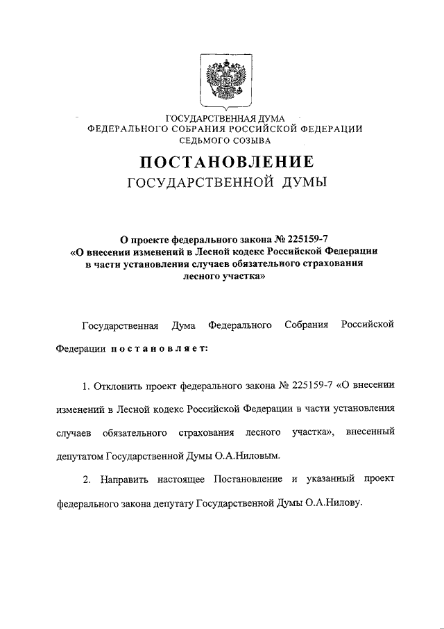 "О ПРОЕКТЕ ФЕДЕРАЛЬНОГО ЗАКОНА N 225159-7 "О ВНЕСЕНИИ ИЗМЕНЕНИЙ В ЛЕСНОЙ КОДЕКС РОССИЙСКОЙ ФЕДЕРАЦИИ В ЧАСТИ УСТАНОВЛЕНИЯ СЛУЧАЕВ ОБЯЗАТЕЛЬНОГО СТРАХОВАНИЯ ЛЕСНОГО УЧАСТКА"