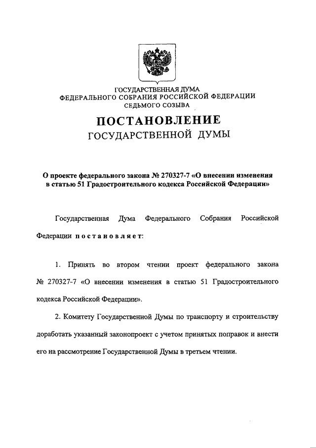 "О ПРОЕКТЕ ФЕДЕРАЛЬНОГО ЗАКОНА N 270327-7 "О ВНЕСЕНИИ ИЗМЕНЕНИЯ В СТАТЬЮ 51 ГРАДОСТРОИТЕЛЬНОГО КОДЕКСА РОССИЙСКОЙ ФЕДЕРАЦИИ"