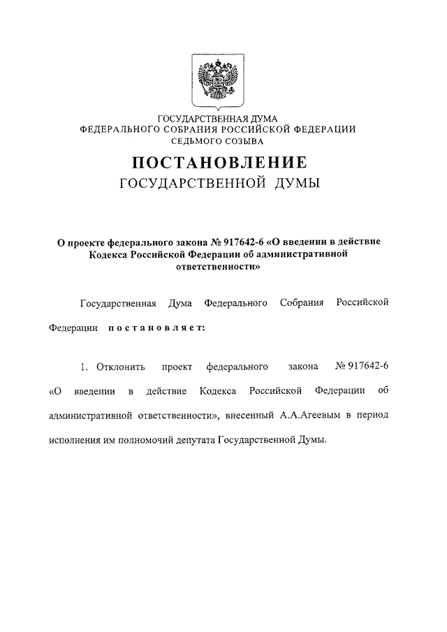 "О ПРОЕКТЕ ФЕДЕРАЛЬНОГО ЗАКОНА N 917642-6 "О ВВЕДЕНИИ В ДЕЙСТВИЕ КОДЕКСА РОССИЙСКОЙ ФЕДЕРАЦИИ ОБ АДМИНИСТРАТИВНОЙ ОТВЕТСТВЕННОСТИ"