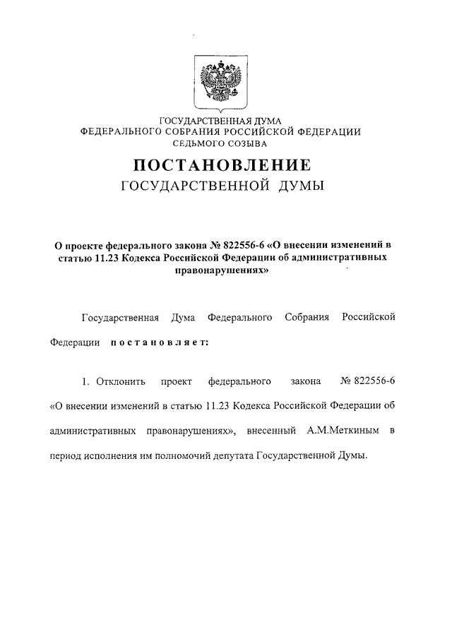 "О ПРОЕКТЕ ФЕДЕРАЛЬНОГО ЗАКОНА N 822556-6 "О ВНЕСЕНИИ ИЗМЕНЕНИЙ В СТАТЬЮ 11.23 КОДЕКСА РОССИЙСКОЙ ФЕДЕРАЦИИ ОБ АДМИНИСТРАТИВНЫХ ПРАВОНАРУШЕНИЯХ"