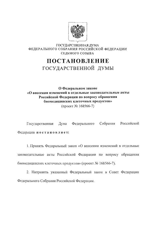 "О ФЕДЕРАЛЬНОМ ЗАКОНЕ "О ВНЕСЕНИИ ИЗМЕНЕНИЙ В ОТДЕЛЬНЫЕ ЗАКОНОДАТЕЛЬНЫЕ АКТЫ РОССИЙСКОЙ ФЕДЕРАЦИИ ПО ВОПРОСУ ОБРАЩЕНИЯ БИОМЕДИЦИНСКИХ КЛЕТОЧНЫХ ПРОДУКТОВ" (ПРОЕКТ N 168566-7)"