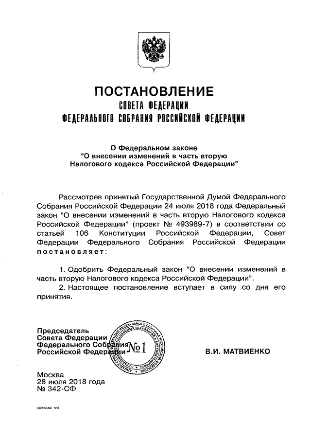 ПОСТАНОВЛЕНИЕ СФ ФС РФ от 28.07.2018 N 342-СФ