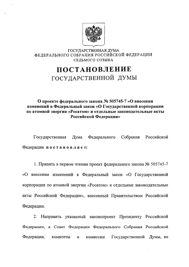 "О ПРОЕКТЕ ФЕДЕРАЛЬНОГО ЗАКОНА N 505745-7 "О ВНЕСЕНИИ ИЗМЕНЕНИЙ В ФЕДЕРАЛЬНЫЙ ЗАКОН "О ГОСУДАРСТВЕННОЙ КОРПОРАЦИИ ПО АТОМНОЙ ЭНЕРГИИ "РОСАТОМ" И ОТДЕЛЬНЫЕ ЗАКОНОДАТЕЛЬНЫЕ АКТЫ РОССИЙСКОЙ ФЕДЕРАЦИИ"