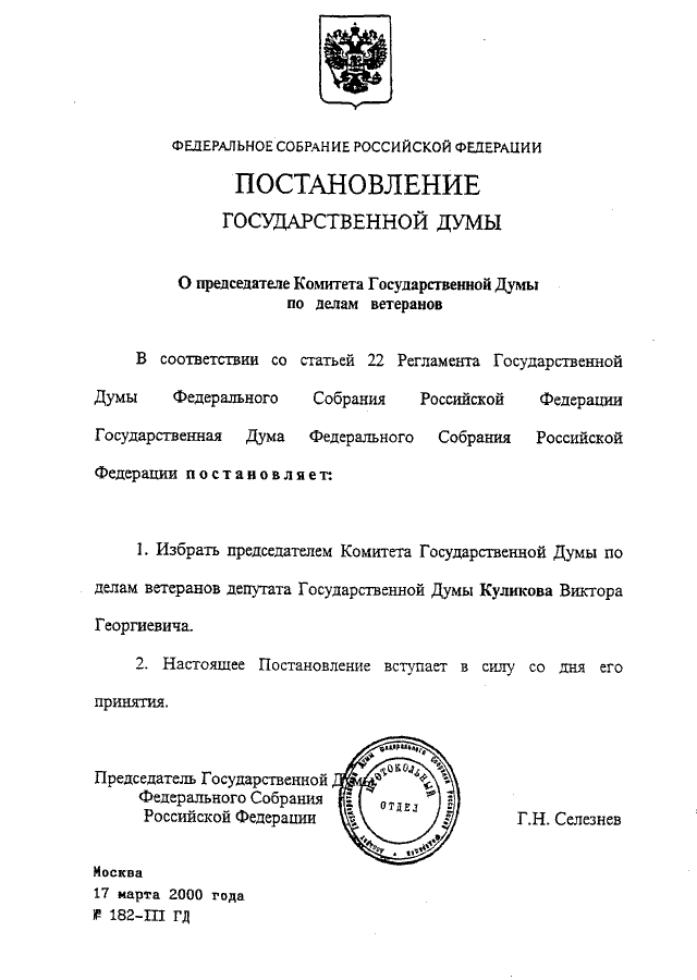 "О ПРЕДСЕДАТЕЛЕ КОМИТЕТА ГОСУДАРСТВЕННОЙ ДУМЫ ПО ДЕЛАМ ВЕТЕРАНОВ"