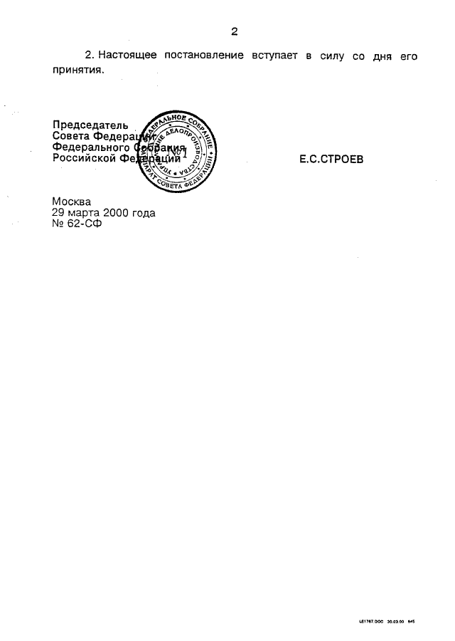 ПОСТАНОВЛЕНИЕ СФ ФС РФ от 29.03.2000 N 62-СФ