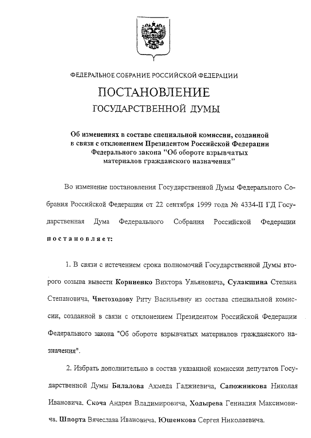 "ОБ ИЗМЕНЕНИЯХ В СОСТАВЕ СПЕЦИАЛЬНОЙ КОМИССИИ, СОЗДАННОЙ В СВЯЗИ С ОТКЛОНЕНИЕМ ПРЕЗИДЕНТОМ РОССИЙСКОЙ ФЕДЕРАЦИИ ФЕДЕРАЛЬНОГО ЗАКОНА "ОБ ОБОРОТЕ ВЗРЫВЧАТЫХ МАТЕРИАЛОВ ГРАЖДАНСКОГО НАЗНАЧЕНИЯ"