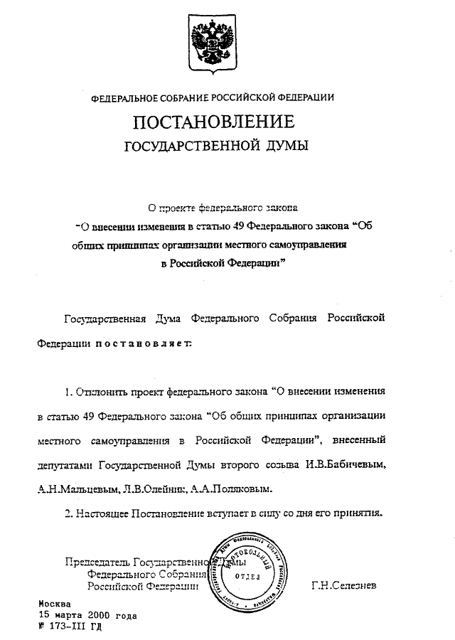 ПОСТАНОВЛЕНИЕ ГД ФС РФ от 15.03.2000 N 173-III ГД