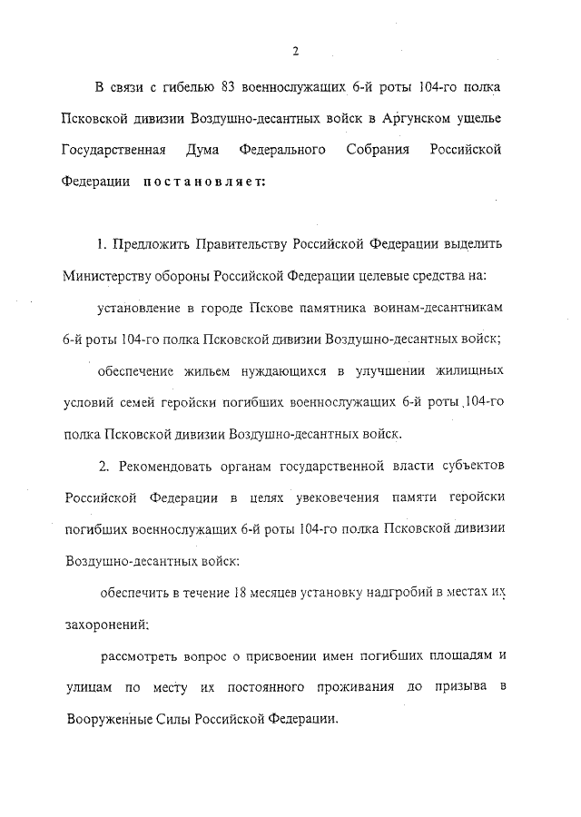 "ОБ УВЕКОВЕЧЕНИИ ПАМЯТИ ГЕРОЙСКИ ПОГИБШИХ ВОЕННОСЛУЖАЩИХ 6-Й РОТЫ 104-ГО ПОЛКА ПСКОВСКОЙ ДИВИЗИИ ВОЗДУШНО - ДЕСАНТНЫХ ВОЙСК"