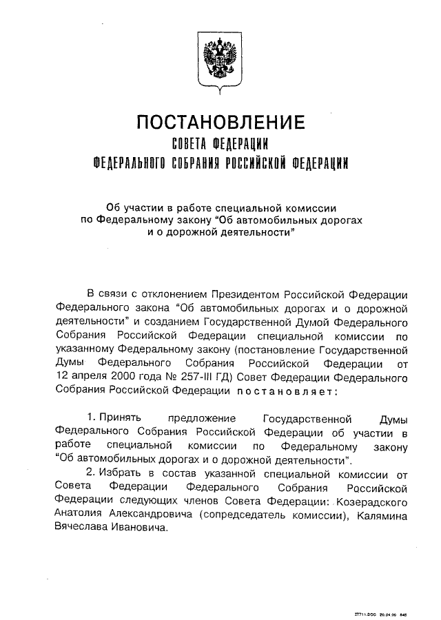 "ОБ УЧАСТИИ В РАБОТЕ СПЕЦИАЛЬНОЙ КОМИССИИ ПО ФЕДЕРАЛЬНОМУ ЗАКОНУ "ОБ АВТОМОБИЛЬНЫХ ДОРОГАХ И О ДОРОЖНОЙ ДЕЯТЕЛЬНОСТИ"