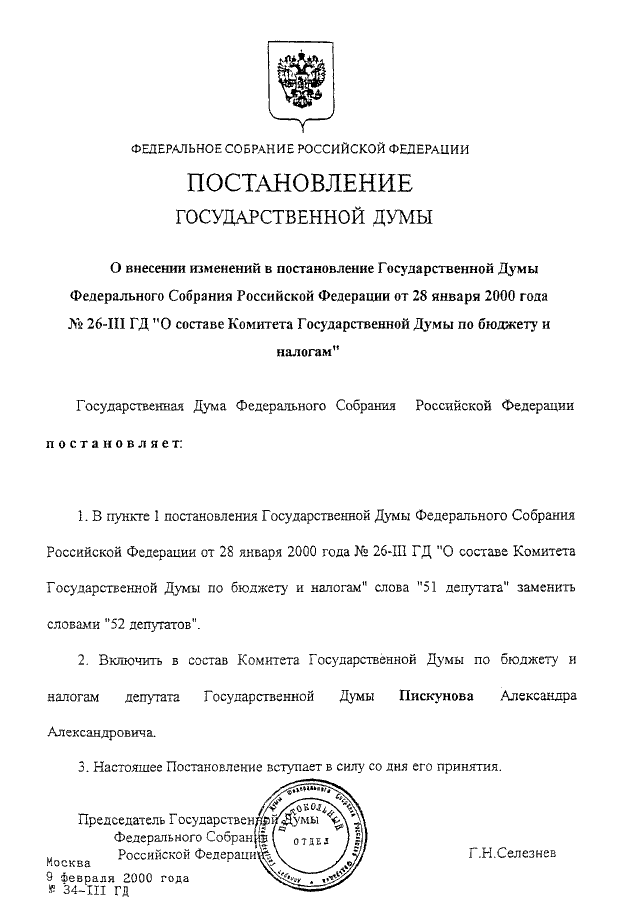 ПОСТАНОВЛЕНИЕ ГД ФС РФ от 09.02.2000 N 34-III ГД
