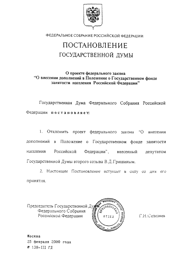 ПОСТАНОВЛЕНИЕ ГД ФС РФ от 25.02.2000 N 138-III ГД