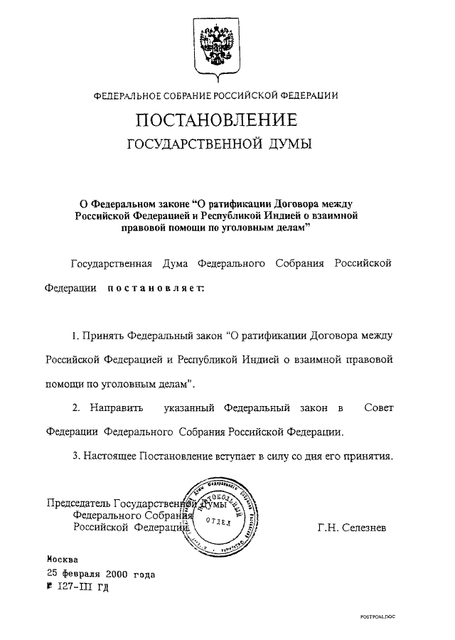 "О ФЕДЕРАЛЬНОМ ЗАКОНЕ "О РАТИФИКАЦИИ ДОГОВОРА МЕЖДУ РОССИЙСКОЙ ФЕДЕРАЦИЕЙ И РЕСПУБЛИКОЙ ИНДИЕЙ О ВЗАИМНОЙ ПРАВОВОЙ ПОМОЩИ ПО УГОЛОВНЫМ ДЕЛАМ"