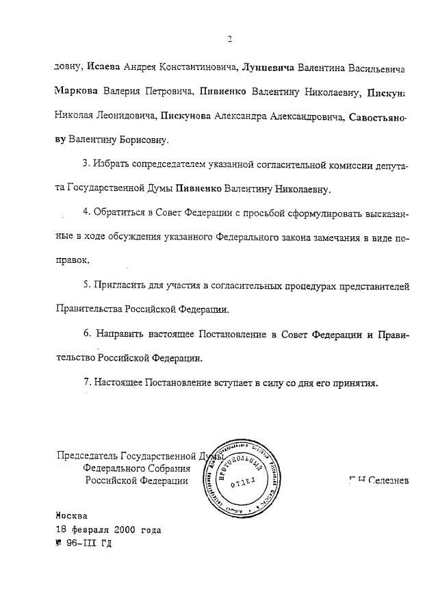 ПОСТАНОВЛЕНИЕ ГД ФС РФ от 18.02.2000 N 96-III ГД