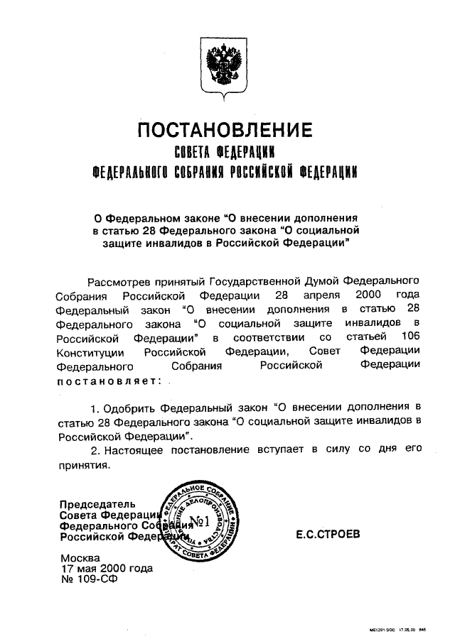 ПОСТАНОВЛЕНИЕ СФ ФС РФ от 17.05.2000 N 109-СФ