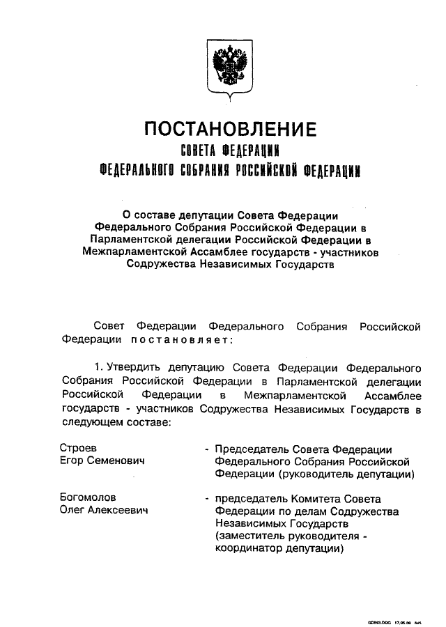 "О СОСТАВЕ ДЕПУТАЦИИ СОВЕТА ФЕДЕРАЦИИ ФЕДЕРАЛЬНОГО СОБРАНИЯ