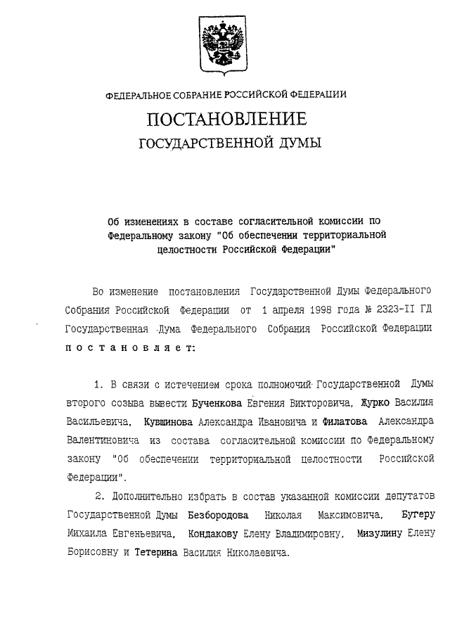 "ОБ ИЗМЕНЕНИЯХ В СОСТАВЕ СОГЛАСИТЕЛЬНОЙ КОМИССИИ ПО ФЕДЕРАЛЬНОМУ ЗАКОНУ "ОБ ОБЕСПЕЧЕНИИ ТЕРРИТОРИАЛЬНОЙ ЦЕЛОСТНОСТИ РОССИЙСКОЙ ФЕДЕРАЦИИ"