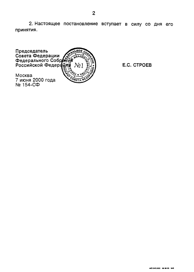 ПОСТАНОВЛЕНИЕ СФ ФС РФ от 07.06.2000 N 154-СФ