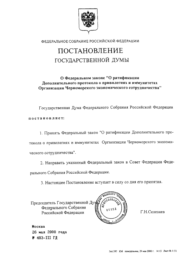 ПОСТАНОВЛЕНИЕ ГД ФС РФ от 26.05.2000 N 403-III ГД