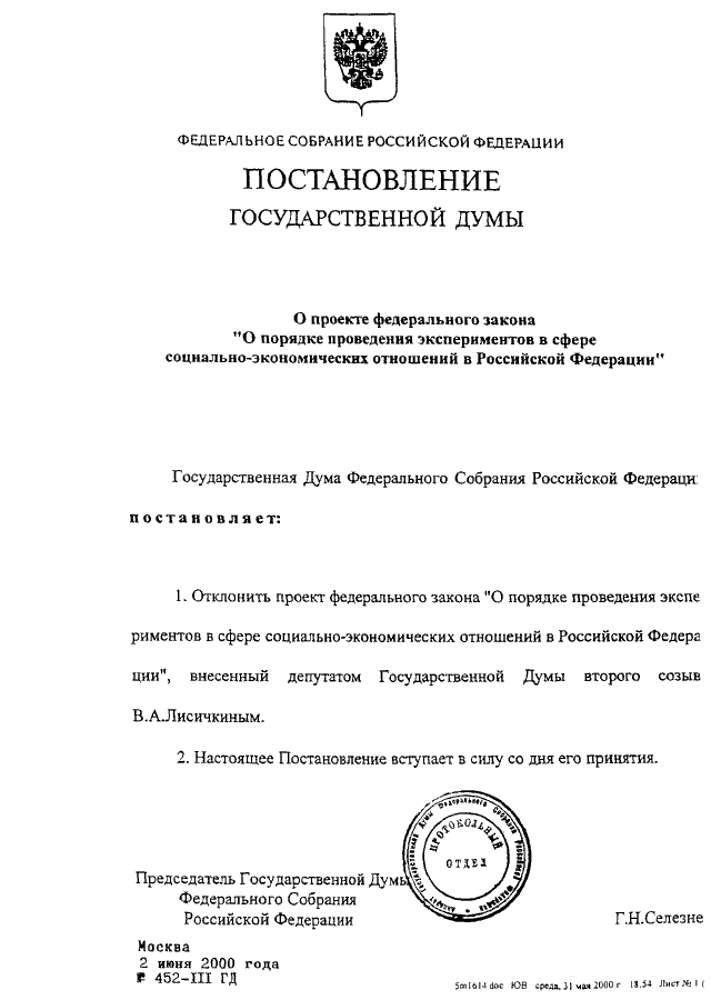 ПОСТАНОВЛЕНИЕ ГД ФС РФ от 02.06.2000 N 452-III ГД