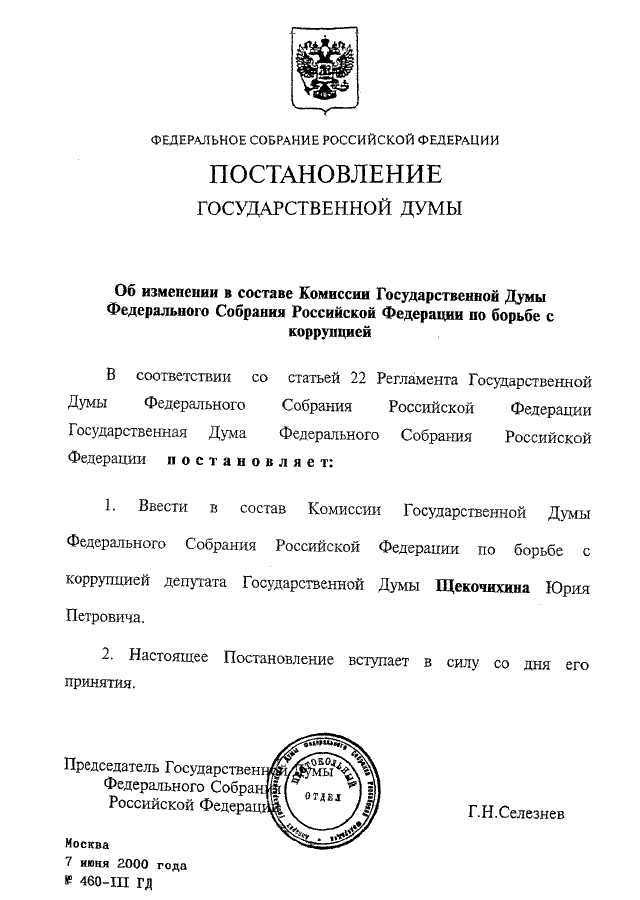 ПОСТАНОВЛЕНИЕ ГД ФС РФ от 07.06.2000 N 460-III ГД
