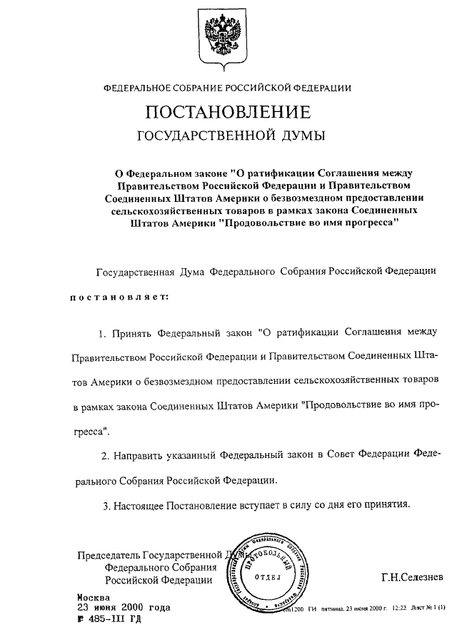 ПОСТАНОВЛЕНИЕ ГД ФС РФ от 23.06.2000 N 485-III ГД