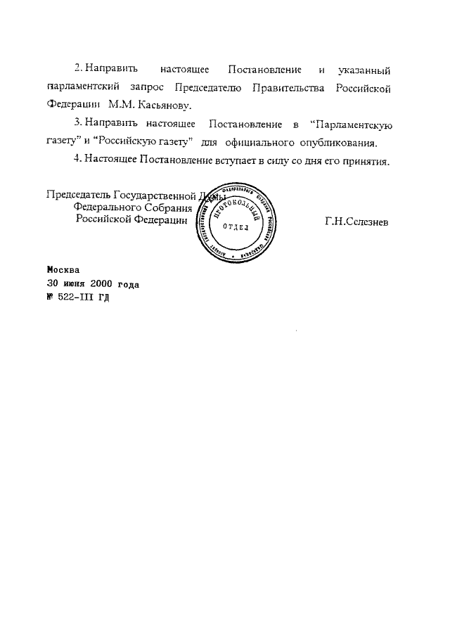 ПОСТАНОВЛЕНИЕ ГД ФС РФ от 30.06.2000 N 522-III ГД