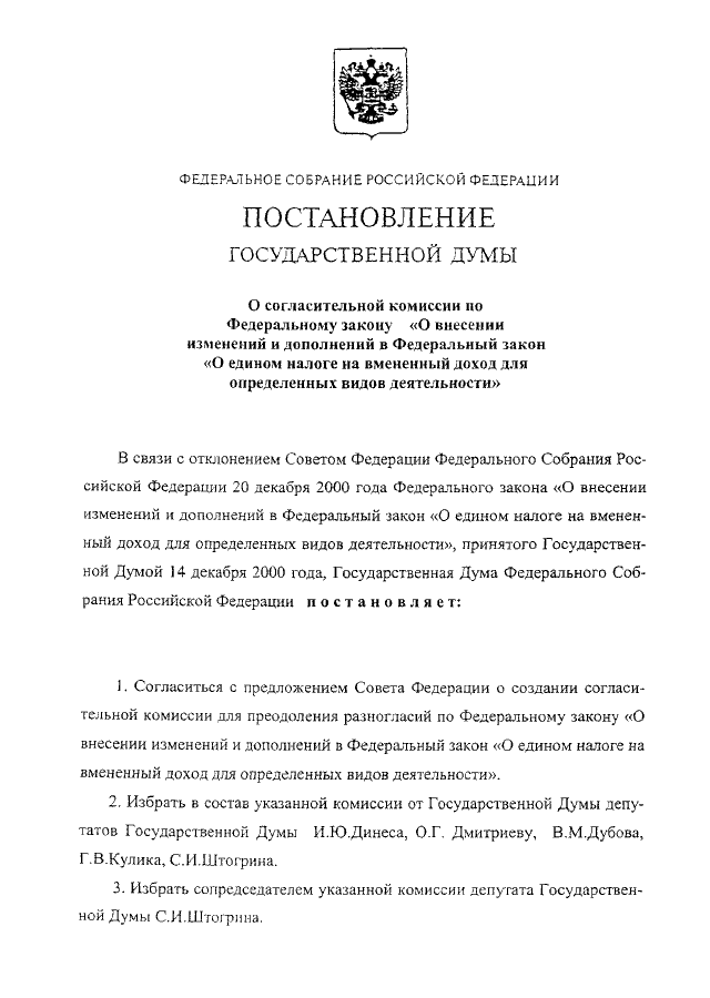 "О СОГЛАСИТЕЛЬНОЙ КОМИССИИ ПО ФЕДЕРАЛЬНОМУ ЗАКОНУ "О ВНЕСЕНИИ ИЗМЕНЕНИЙ И ДОПОЛНЕНИЙ В ФЕДЕРАЛЬНЫЙ ЗАКОН "О ЕДИНОМ НАЛОГЕ НА ВМЕНЕННЫЙ ДОХОД ДЛЯ ОПРЕДЕЛЕННЫХ ВИДОВ ДЕЯТЕЛЬНОСТИ"
