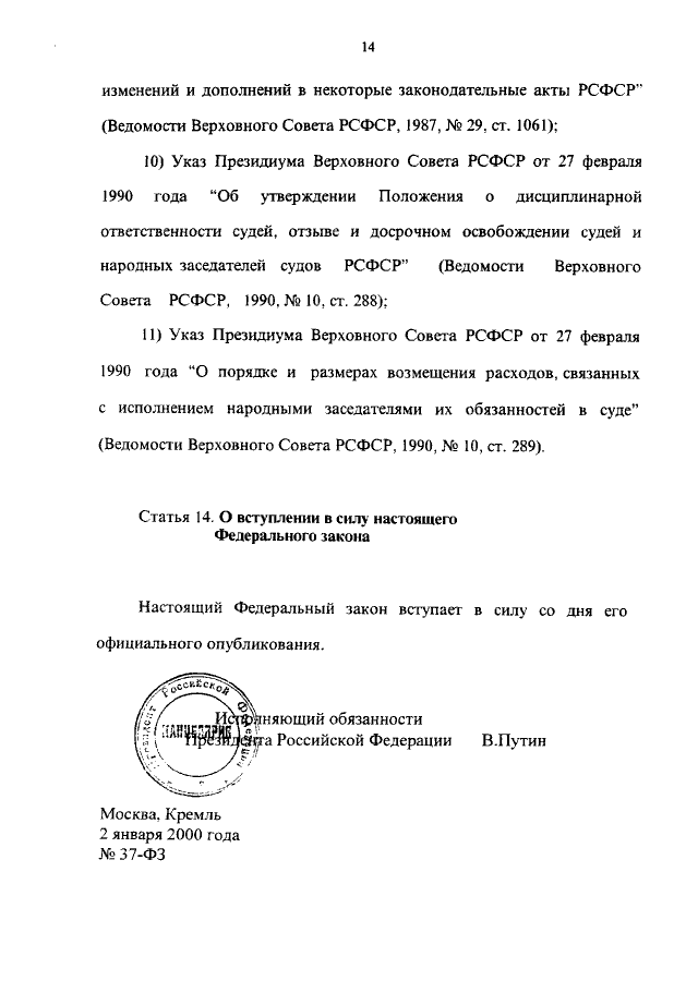 ФЕДЕРАЛЬНЫЙ ЗАКОН от 02.01.2000 N 37-ФЗ
