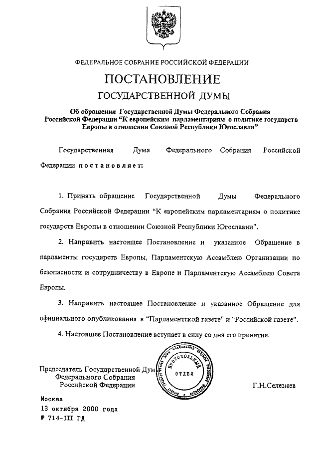 ПОСТАНОВЛЕНИЕ ГД ФС РФ от 13.10.2000 N 714-III ГД