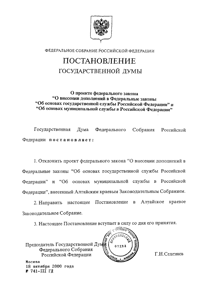 ПОСТАНОВЛЕНИЕ ГД ФС РФ от 18.10.2000 N 741-III ГД